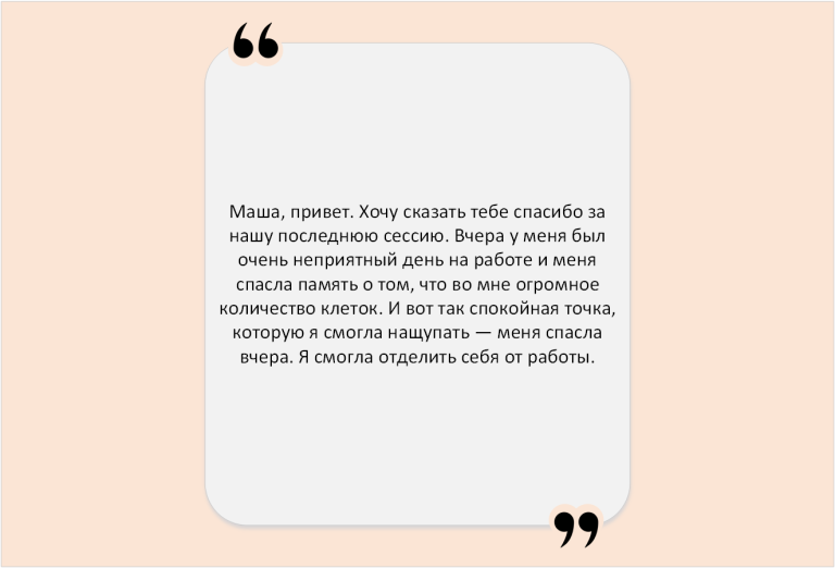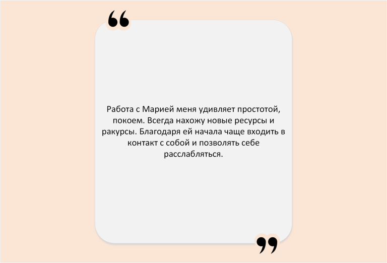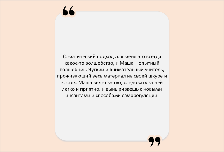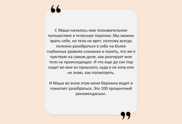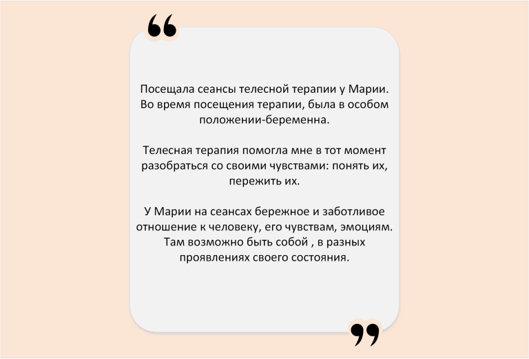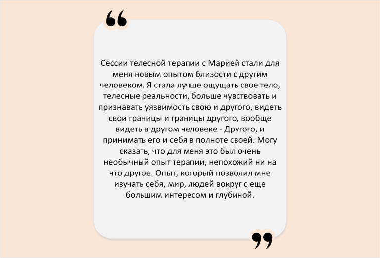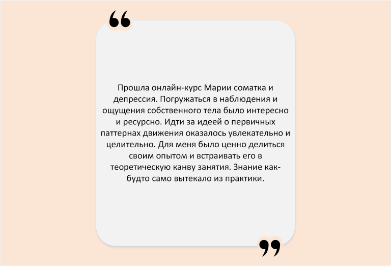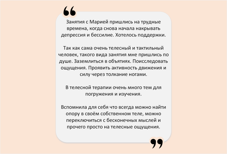 Часто в соматику приходят за поддержкой – по ситуации. И запрос – просто побыть собой в присутствии другого – приводит в движения разные сферы жизни. Появляются изменения в отношениях, работе, бизнесе, спорте. Само собой приходят результаты, которые приятно удивляют.