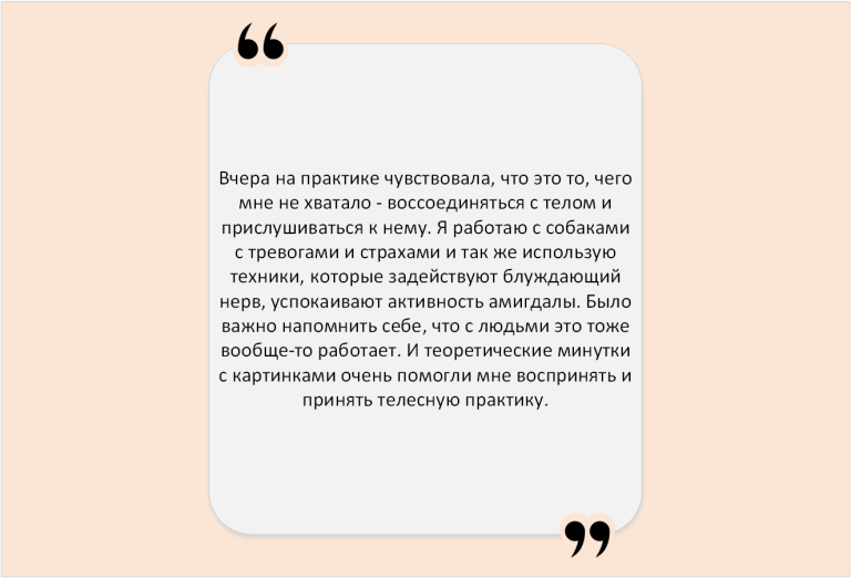 Я замечала, что через движение и прикосновение – происходит то, что часто сложно объяснить словами. Но то, что успокаивает, уравновешивает, вселяет надежду. Меняет ощущение клеточного ужаса и изоляции на безопасность и радость жизни в контакте с собой и другими.